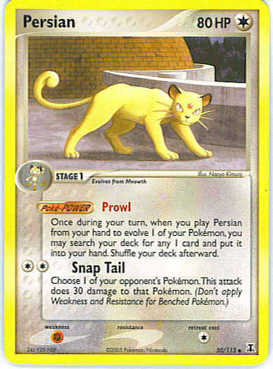 | Type | Colorless | | Pokemon serie | Delta Species | | Stadie | Stage 1 | | HP | 80 | | Sjældenhed | Uncommon | | Tilbagetrækning | 1 | | Svaghed | F | | Kortnummer | 50 | | Evne | [CC] Snap Tail - Choose 1 of your opponent's Pokemon. This attack does 30 damage to that Pokemon. (Don't apply Weakness and Resistance for Benched Pokemon.) | | Evne2 | [CC] Snap Tail - Choose 1 of your opponent's Pokemon. This attack does 30 damage to that Pokemon. (Don't apply Weakness and Resistance for Benched Pokemon.) | | Kunstner | Naoyo Kimura |