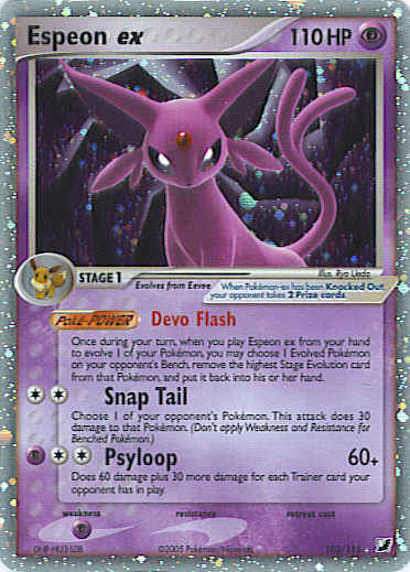 | Type | Psychic | | Pokemon serie | Unseen Forces | | Stadie | Stage 1 | | HP | 110 | | Sjældenhed | Ultra-Rare | | Svaghed | P | | Kortnummer | 102 | | Evne | [CC] Snap Tail - Choose 1 of your opponent's Pokemon. This attack does 30 damage to that Pokemon. (Don't apply Weakness and Resistance for Benched Pokemon.) [CCP] Psyloop (60+) Does 60 damage plus 30 more damage for each Trainer card your opponent has in play. | | Evne2 | [CC] Snap Tail - Choose 1 of your opponent's Pokemon. This attack does 30 damage to that Pokemon. (Don't apply Weakness and Resistance for Benched Pokemon.) [CCP] Psyloop (60+) Does 60 damage plus 30 more damage for each Trainer card your opponent has in play. | | Kunstner | Ryo Ueda |