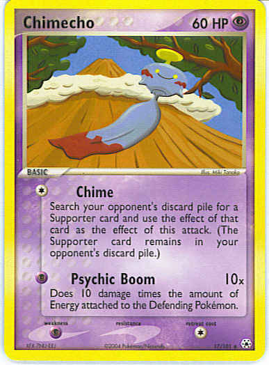 | Type | Psychic | | Pokemon serie | Hidden Legends | | Stadie | Basic | | HP | 60 | | Sjældenhed | Rare | | Tilbagetrækning | 1 | | Svaghed | P | | Kortnummer | 17 | | Evne | [C] Chime - Search your opponent's discard pile for a Supporter card and use the effect of that card as the effect of this attack. (The Supporter card remains in your opponent's discard pile.) [P] Psychic Boom (10x) Does 10 damage times the amount of Energy attached to the Defending Pokemon. | | Evne2 | [C] Chime - Search your opponent's discard pile for a Supporter card and use the effect of that card as the effect of this attack. (The Supporter card remains in your opponent's discard pile.) [P] Psychic Boom (10x) Does 10 damage times the amount of Energy attached to the Defending Pokemon. | | Kunstner | Miki Tanaka |