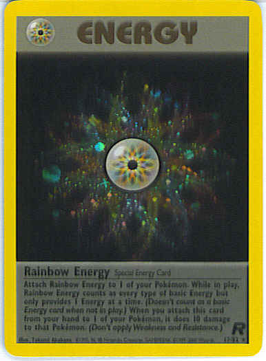 Evne Attach Rainbow Energy to 1 of your Pokemon. While in play, Rainbow Energy counts as every type of basic Energy but only provides 1 Energy at a time. (Doesn't count as a basic Energy card when not in play.) When you attach this card from your hand to 1 of your Pokemon, it does 10 damage to that Pokemon. (Don't apply Weakness and Resistance.)