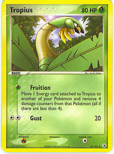 | Type | Grass | | Pokemon serie | Hidden Legends | | Stadie | Basic | | HP | 80 | | Sjældenhed | Rare | | Tilbagetrækning | 1 | | Svaghed | R | | Kortnummer | 27 | | Evne | [C] Fruition - Move 1 Energy card attached to Tropius to another of your Pokemon and remove 4 damage counters from that Pokemon (all if there are less than 4). [CC] Gust (20) | | Evne2 | [C] Fruition - Move 1 Energy card attached to Tropius to another of your Pokemon and remove 4 damage counters from that Pokemon (all if there are less than 4). [CC] Gust (20) | | Kunstner | Kouki Saitou |