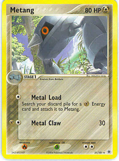 | Type | Metal | | Pokemon serie | Hidden Legends | | Stadie | Stage 1 | | HP | 80 | | Sjældenhed | Rare | | Tilbagetrækning | 2 | | Modstand | G | | Svaghed | R | | Kortnummer | 21 | | Evne | [C] Metal Load - Search your discard pile for a M Energy card and attach it to Metang. [CM] Metal Claw (30) | | Evne2 | [C] Metal Load - Search your discard pile for a M Energy card and attach it to Metang. [CM] Metal Claw (30) | | Kunstner | Mitsuhiro Arita |
