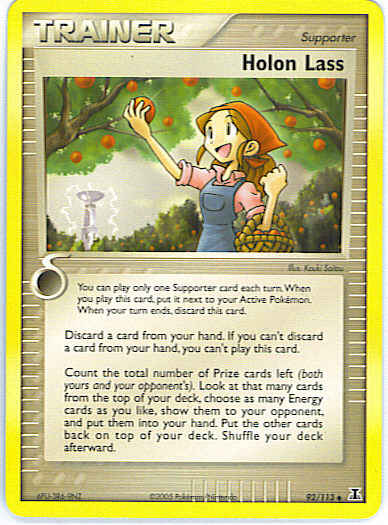 Discard a card from your hand. If you can't discard a card from your hand, you can't play this card. Count the number of Prize cards left (both yours and your opponent's). Look at that many cards from the top of your deck, choose as many Energy cards as you like, show them to your opponent, and put them into your hand. Put the other cards back on top of your deck. Shuffle your deck afterward.