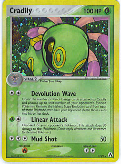 Evne [CC] Devolution Wave - Count the number of React Energy cards attached to Cradily and choose up to that number of your opponent's Evolved Pokemon. Remove the highest Stage Evolution card from each of those Pokemon, then have your opponent shuffle those cards into his or her deck.