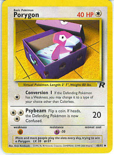 | Type | Colorless | | Pokemon serie | Team Rocket | | Stadie | Basic | | HP | 40 | | Sjældenhed | Uncommon | | Tilbagetrækning | 3 | | Modstand | P | | Svaghed | F | | Kortnummer | 48 | | Evne |