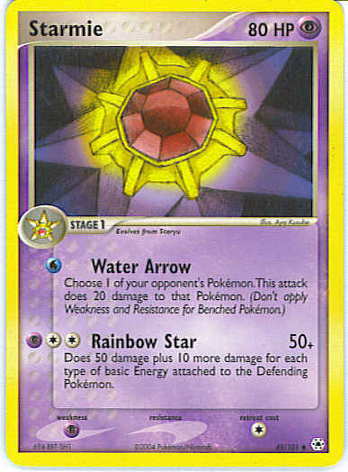 | Type | Psychic | | Pokemon serie | Hidden Legends | | Stadie | Stage 1 | | HP | 80 | | Sjældenhed | Uncommon | | Tilbagetrækning | 1 | | Svaghed | P | | Kortnummer | 49 | | Evne | [W] Water Arrow - Choose 1 of your opponent's Pokemon. This attack does 20 damage to that Pokemon. (Don't apply Weakness and Resistance for Benched Pokemon.) [CCP] Rainbow Star (50+) Does 50 damage plus 10 more damage for each type of basic Energy attached to the Defending Pokemon. | | Evne2 | [W] Water Arrow - Choose 1 of your opponent's Pokemon. This attack does 20 damage to that Pokemon. (Don't apply Weakness and Resistance for Benched Pokemon.) [CCP] Rainbow Star (50+) Does 50 damage plus 10 more damage for each type of basic Energy attached to the Defending Pokemon. | | Kunstner | Aya Kusube |