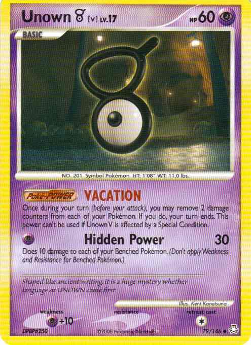 | Type | Psychic | | Pokemon serie | Legends Awakened | | Stadie | Basic | | HP | 60.0 | | Sjældenhed | Uncommon | | Tilbagetrækning | 1.0 | | Svaghed | P+10 | | Kortnummer | 79 | | Evne | [P] Hidden Power (30) Does 10 damage to each of your Benched Pokemon. (Don't apply Weakness and Resistance for Benched Pokemon.)
