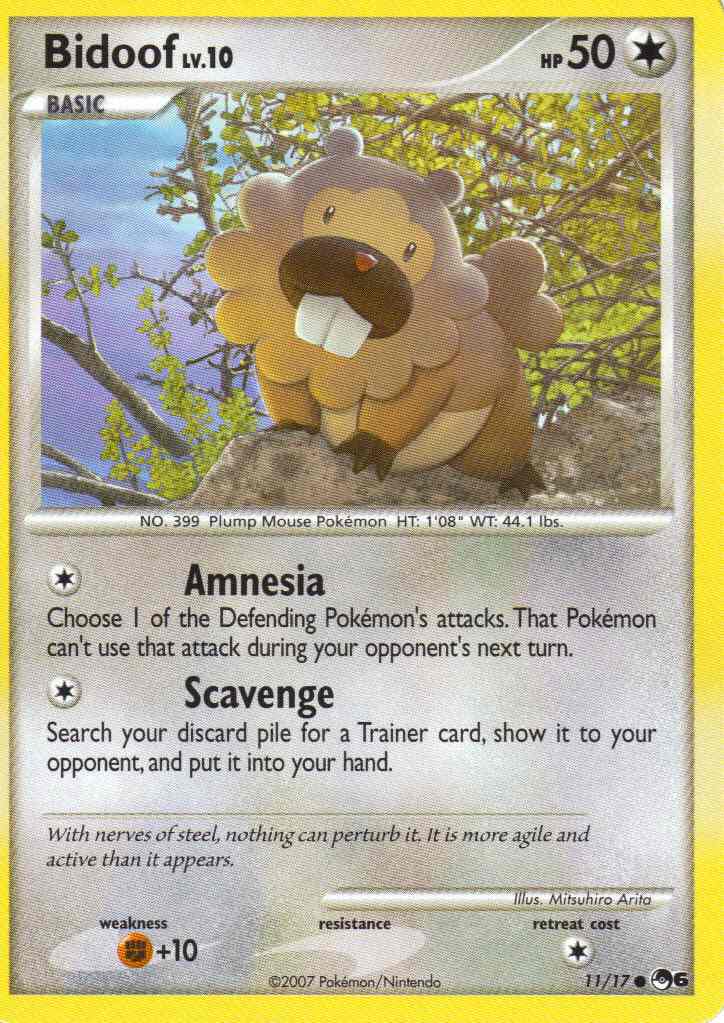 | Type | Colorless | | Pokemon serie | OP Series 6 | | Stadie | Basic | | HP | 50 | | Sjældenhed | Common | | Tilbagetrækning | 1 | | Svaghed | F+10 | | Kortnummer | 11 | | Evne | [C] Amnesia - Choose 1 of the Defending Pokemon's attacks. That Pokemon can't use that attack during your opponent's next turn. [C] Scavenge - Search you discard pile for a Trainer card, show it to your opponent, and put it into your hand.