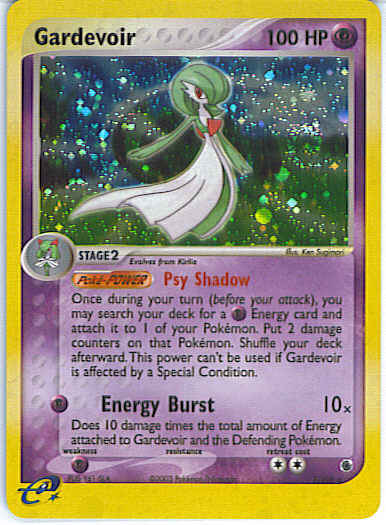 | | Evne2 | [P] Energy Burst (10x) Does 10 damage times the total amount of Energy attached to Gardevoir and the Defending Pokemon.
