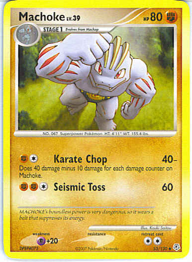 | Type | Fighting | | Pokemon serie | Diamond and Pearl | | Stadie | Stage 1 | | HP | 80 | | Sjældenhed | Uncommon | | Tilbagetrækning | 2 | | Svaghed | P+20 | | Kortnummer | 53 | | Evne |