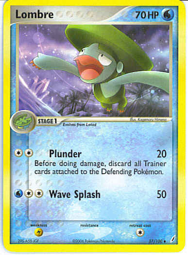 | Type | Water | | Pokemon serie | Crystal Guardians | | Stadie | Stage 1 | | HP | 70 | | Sjældenhed | Uncommon | | Tilbagetrækning | 1 | | Svaghed | L | | Kortnummer | 37 | | Evne | [CC] Plunder (20) Before doing damage, discard all Trainer cards attached to the Defending Pokemon. [CCW] Wave Splash (50) | | Evne2 | [CC] Plunder (20) Before doing damage, discard all Trainer cards attached to the Defending Pokemon. [CCW] Wave Splash (50) | | Kunstner | Kagemaru Himeno |