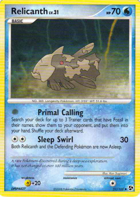 | Type | Water | | Pokemon serie | Great Encounters | | Stadie | Basic | | HP | 70.0 | | Sjældenhed | Uncommon | | Tilbagetrækning | 1.0 | | Svaghed | L+20 | | Kortnummer | 51 | | Evne | [0] Primal Calling - Search your deck for up to 3 Trainer cards that have Fossil in their name, show them to your opponent, and put them into your hand. Shuffle your deck afterward. [CC] Sleep Swirl (30) Both Relicanth and the Defending Pokemon are now Asleep.