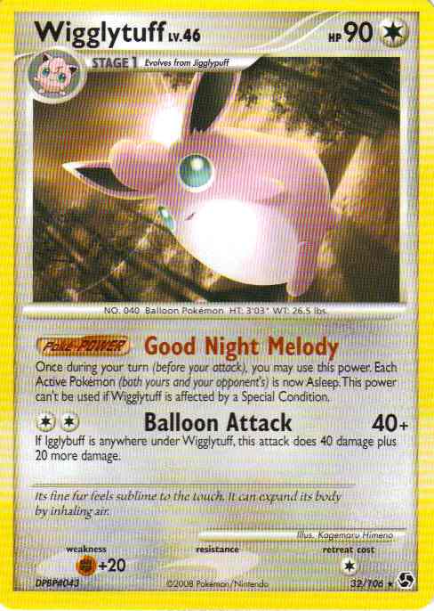| Type | Colorless | | Pokemon serie | Great Encounters | | Stadie | Stage 1 | | HP | 90.0 | | Sjældenhed | Rare | | Tilbagetrækning | 1.0 | | Svaghed | F+20 | | Kortnummer | 32 | | Evne | [CC] Balloon Attack (40+) If Igglybuff is anywhere under Wigglytuff, this attack does 40 damage plus 20 more damage.