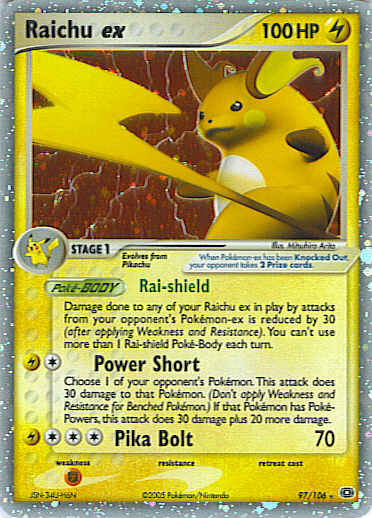 | Type | Lightning | | Pokemon serie | Emerald | | Stadie | Stage 1 | | HP | 100 | | Sjældenhed | Ultra-Rare | | Svaghed | F | | Kortnummer | 97 | | Evne | [CL] Power Short - Choose 1 of your opponent's Pokemon. This attack does 30 damage to that Pokemon. (Don't apply Weakness and Resistance for Benched Pokemon.) If that Pokemon has Poke-Powers, this attack does 30 damage plus 20 more damage. [CCCL] Pika Bolt (70) | | Evne2 | [CL] Power Short - Choose 1 of your opponent's Pokemon. This attack does 30 damage to that Pokemon. (Don't apply Weakness and Resistance for Benched Pokemon.) If that Pokemon has Poke-Powers, this attack does 30 damage plus 20 more damage. [CCCL] Pika Bolt (70) | | Kunstner | Mitsuhiro Arita |