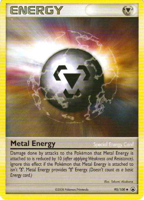 Evne2 Damage done by attacks to the Pokemon that Metal Energy is attached to is reduced by 10 (after applying Weakness and Resistance). Ignore this effect if the Pokemon that Metal Energy is attached to isn't M. Metal Energy provides M Energy. (Doesn't count as a basic Energy card.) (Major text change in Ruby/Sapphire. Using earlier versions requires reference.)