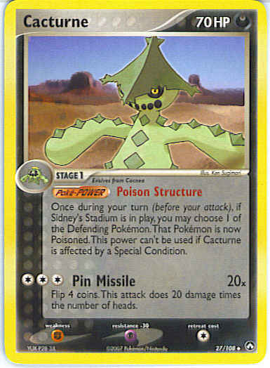 | Type | Darkness | | Pokemon serie | Power Keepers | | Stadie | Stage 1 | | HP | 70 | | Sjældenhed | Uncommon | | Tilbagetrækning | 1 | | Modstand | P | | Svaghed | F | | Kortnummer | 27 | | Evne |