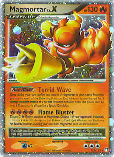 [RRRR] Flame Bluster - Discard 2 R Energy attached to Magmortar. Choose 1 of your opponent's Pokemon. This attack does 100 damage to that Pokemon. (Don't apply Weakness and Resistance for Benched Pokemon.) During your next turn, Magmortar can't use Flame Bluster.