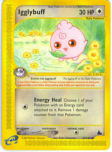| Type | Colorless | | Pokemon serie | Skyridge | | Stadie | Baby | | HP | 30 | | Sjældenhed | Common | | Tilbagetrækning | 1 | | Kortnummer | 67 | | Evne | [C] Energy Heal - Choose 1 of your Pokemon with an Energy card attached to it. Remove 1 damage counter from that Pokemon.