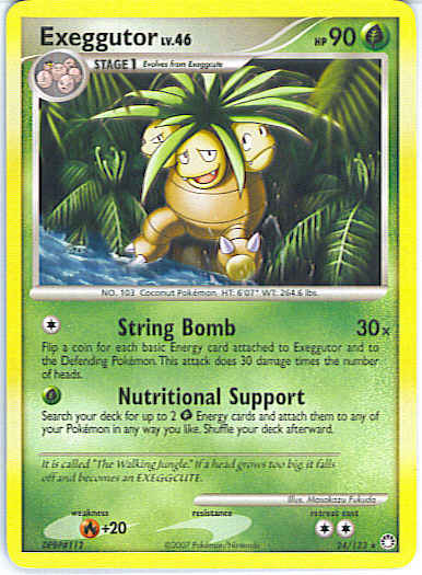 [C] String Bomb - Flip a coin for each basic Energy card attached to Exeggutor and to the Defending Pokemon. This attack does 30 damage time the number of heads.