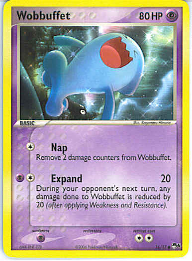 | Type | Psychic | | Pokemon serie | OP Series 4 | | Stadie | Basic | | HP | 80 | | Sjældenhed | Common | | Tilbagetrækning | 2 | | Svaghed | P | | Kortnummer | 16 | | Evne | [C] Nap - Remove 2 damage counters from Wobbuffet. [CP] Expand (20) During your opponent's next turn, any damage done to Wobbuffet is reduced by 20 (after applying Weakness and Resistance).