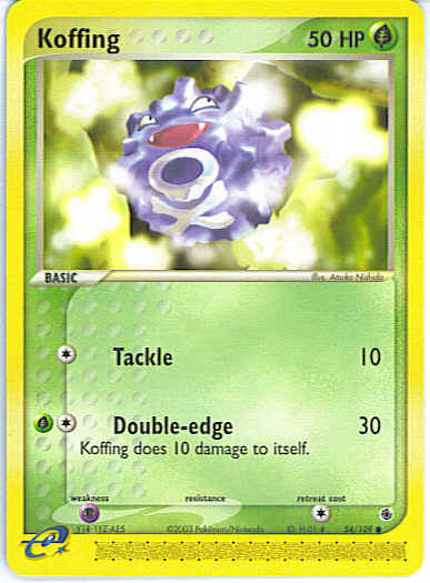 | Type | Grass | | Pokemon serie | Ruby Sapphire | | Stadie | Basic | | HP | 50 | | Sjældenhed | Common | | Tilbagetrækning | 1 | | Svaghed | P | | Kortnummer | 54 | | Evne | [C] Tackle (10) [CG] Double Edge (30) Koffing does 10 damage to itself.