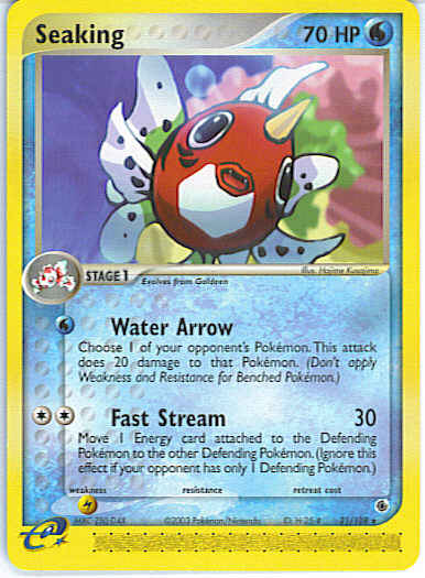 | Evne | [W] Water Arrow - Choose 1 of your opponent's Pokemon. This attack does 20 damage to that Pokemon. (Don't apply Weakness and Resistance for Benched Pokemon.) [CC] Fast Stream (30) Move 1 Energy card attached to the Defending Pokemon to the other Defending Pokemon. (Ignore this effect if your opponent has only 1 Defending Pokemon.)