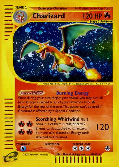 | Type | Fire | | Pokemon serie | Expedition | | Stadie | Stage 2 | | HP | 120 | | Sjældenhed | Rare | | Tilbagetrækning | 3 | | Svaghed | W | | Kortnummer | 6 | | Evne |