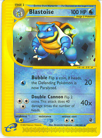 | Type | Water | | Pokemon serie | Expedition | | Stadie | Stage 2 | | HP | 100 | | Sjældenhed | Rare | | Tilbagetrækning | 2 | | Svaghed | L | | Kortnummer | 36 | | Evne |