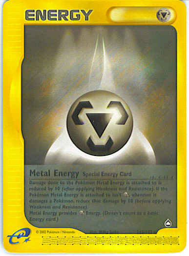 Damage done to the Pokemon Metal Energy is attached to is reduced by 10 (after applying Weakness and Resistance). If the Pokemon Metal Energy is attached to isn't M, whenever it damages a Pokemon with an attack, reduce that damage by 10 (after applying Weakness and Resistance.) Metal Energy provides M Energy. (Doesn't count as a basic Energy card.)
