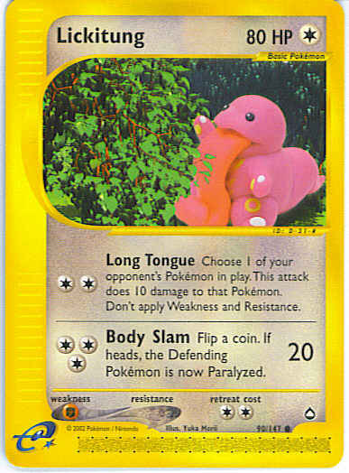| Type | Colorless | | Pokemon serie | Aquapolis | | Stadie | Basic | | HP | 80 | | Sjældenhed | Common | | Tilbagetrækning | 2 | | Svaghed | F | | Kortnummer | 90 | | Evne | [CC] Long Tongue - Choose 1 of your opponent's Pokemon. This attack does 10 damage to that Pokemon. Don't apply Weakness and Resistance. [CCC] Body Slam (20) Flip a coin. If heads, the Defending Pokemon is now Paralyzed.