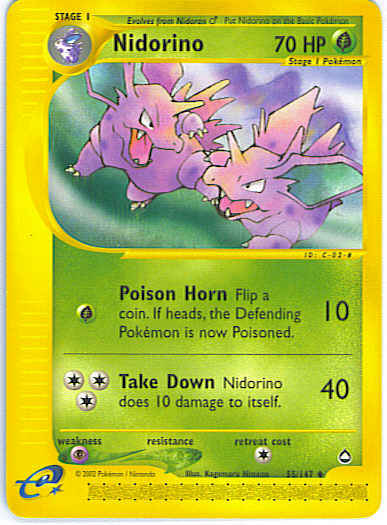 | Type | Grass | | Pokemon serie | Aquapolis | | Stadie | Stage 1 | | HP | 70 | | Sjældenhed | Uncommon | | Tilbagetrækning | 1 | | Svaghed | P | | Kortnummer | 55 | | Evne | [G] Poison Horn (10) Flip a coin. If heads, the Defending Pokemon is now Poisoned. [CCC] Take Down (40) Nidorino does 10 damage to itself.