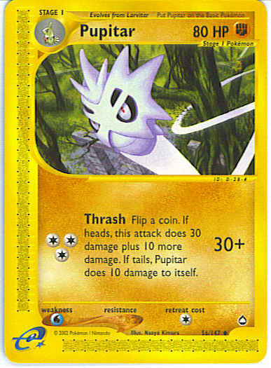 | Type | Fighting | | Pokemon serie | Aquapolis | | Stadie | Stage 1 | | HP | 80 | | Sjældenhed | Uncommon | | Tilbagetrækning | 1 | | Svaghed | W | | Kortnummer | 56 | | Evne | [CCC] Thrash (30+) Flip a coin. If heads, this attack does 30 damage plus 10 more damage. If tails, Pupitar does 10 damage to itself.
