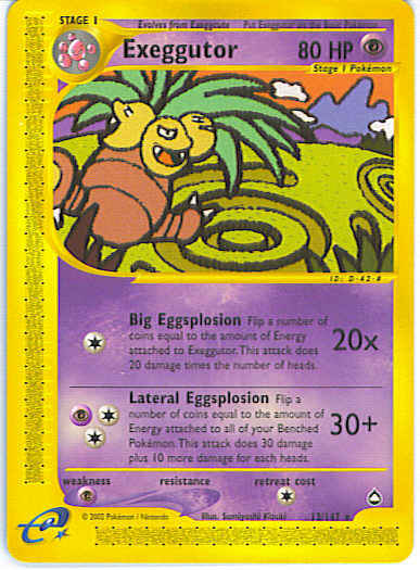 | Evne | [C] Big Eggsplosion (20x) Flip a number of coins equal to the number of Energy attached to Exeggutor. This attack does 20 damage times the number of heads. [CCP] Lateral Eggsplosion (30+) Flip a number of coins equal to the total number of Energy attached to your Benched Pokemon. This attack does 30 damage plus 10 more damage for each heads.