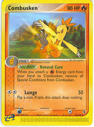 | Type | Fire | | Pokemon serie | Ruby Sapphire | | Stadie | Stage 1 | | HP | 80 | | Sjældenhed | Uncommon | | Tilbagetrækning | 1 | | Svaghed | W | | Kortnummer | 28 | | Evne | [CC] Lunge (50) Flip a coin. If tails, this attack does nothing.