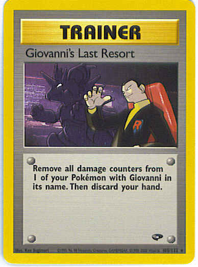 Remove all damage counters from 1 of your Pokemon with Giovanni in its name. Then discard your hand.