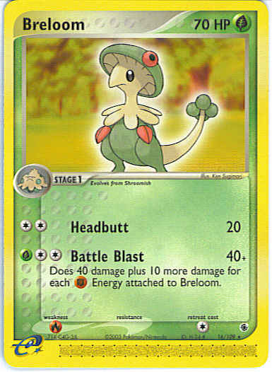 | Type | Grass | | Pokemon serie | Ruby Sapphire | | Stadie | Stage 1 | | HP | 70 | | Sjældenhed | Rare | | Tilbagetrækning | 1 | | Svaghed | R | | Kortnummer | 16 | | Evne | [CC] Headbutt (20) [CCG] Battle Blast (40+) Does 40 damage plus 10 more damage for each F Energy attached to Breloom.