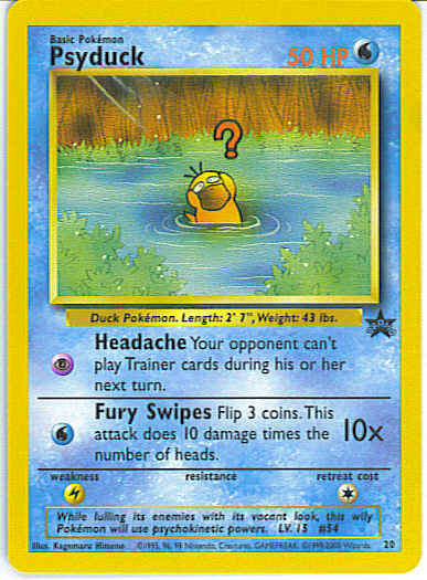 | Type | Water | | Pokemon serie | WoTC Promo | | Stadie | Basic | | HP | 50 | | Sjældenhed | Promo | | Tilbagetrækning | 1 | | Svaghed | L | | Kortnummer | 20 | | Evne |