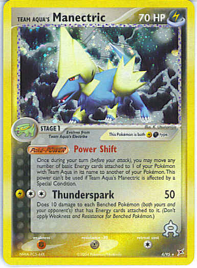 | Type | Darkness Lightning | | Pokemon serie | Team Aqua-Team Magma | | Stadie | Stage 1 | | HP | 70 | | Sjældenhed | Rare | | Tilbagetrækning | 1 | | Modstand | M | | Svaghed | F | | Kortnummer | 4 | | Evne | [CCL] Thunderspark (50) Does 10 damage to each Benched Pokemon (both yours and your opponent's) that has Energy cards attached to it. (Don't apply Weakness and Resistance for Benched Pokemon.)