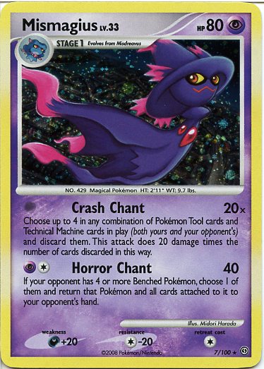 [0] Crash Chant (20x) Choose up to 4 in any combination of Pokemon Tool cards and Technical Machine cards in play (both yours and your opponent's) and discard them. This attack does 20 damage times the number of cards discarded in this way.