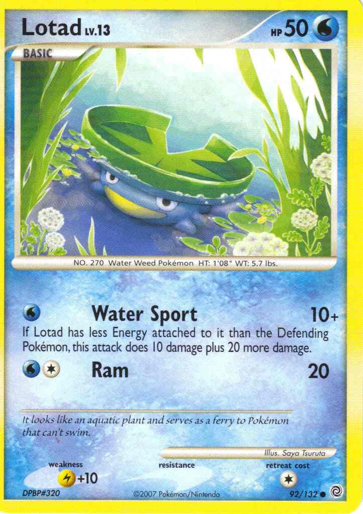 [W] Water Sport (10+) If Lotad has less Energy attached to it than the Defending Pokemon, this attack does 10 damage plus 20 more damage.