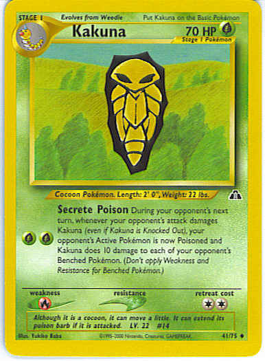 [GG] Secrete Poison - During your opponent's next turn, whenever your opponent's attack damages Kakuna (even if Kakuna is knocked out), your opponent's Active Pokemon is now Poisoned and Kakuna does 10 damage to each of your opponent's Benched Pokemon. (Don't apply Weakness and Resistance for Benched Pokemon.)