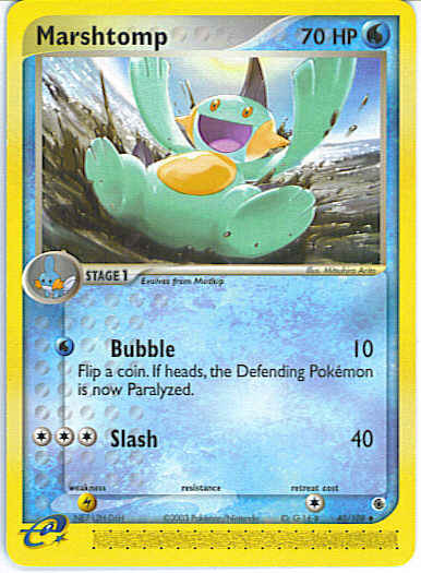 | Type | Water | | Pokemon serie | Ruby Sapphire | | Stadie | Stage 1 | | HP | 70 | | Sjældenhed | Uncommon | | Tilbagetrækning | 1 | | Svaghed | L | | Kortnummer | 40 | | Evne | [W] Bubble (10) Flip a coin. If heads, the Defending Pokemon is now Paralyzed. [CCC] Slash (40)