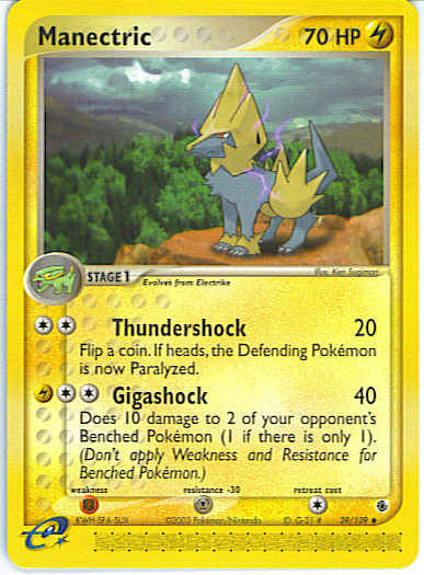 | Type | Lightning | | Pokemon serie | Ruby Sapphire | | Stadie | Stage 1 | | HP | 70 | | Sjældenhed | Uncommon | | Tilbagetrækning | 1 | | Modstand | M | | Svaghed | F | | Kortnummer | 39 | | Evne | [CC] Thundershock (20) Flip a coin. If heads, the Defending Pokemon is now Paralyzed. [CCL] Gigashock (40) Does 10 damage to 2 of your opponent's Benched Pokemon (1 if there is only 1). (Don't apply Weakness and Resistance for Benched Pokemon.)