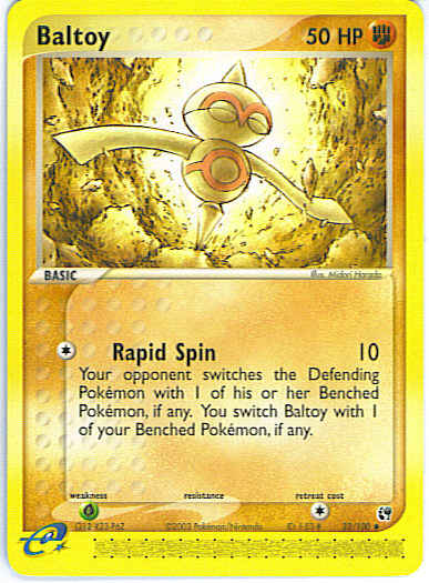 | | Evne2 | [C] Rapid Spin (10) Your opponent switches the Defending Pokemon with 1 of his or her Benched Pokemon, if any. You switch Baltoy with 1 of your Benched Pokemon, if any.