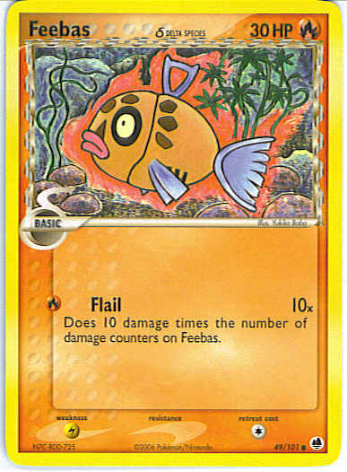 | Type | Fire | | Pokemon serie | Dragon Frontiers | | Stadie | Basic | | HP | 30 | | Sjældenhed | Common | | Tilbagetrækning | 1 | | Svaghed | L | | Kortnummer | 49 | | Evne | [R] Flail (10x) Does 10 damage times the number of damage counters on Feebas.