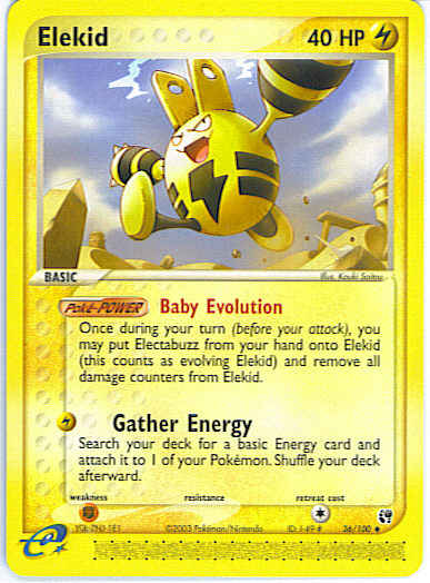 | Type | Lightning | | Pokemon serie | Sandstorm | | Stadie | Basic | | HP | 40 | | Sjældenhed | Uncommon | | Tilbagetrækning | 1 | | Svaghed | F | | Kortnummer | 36 | | Evne | [L] Gather Energy - Search your deck for a basic Energy card and attach it to 1 of your Pokemon. Shuffle your deck afterward.