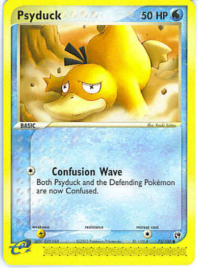 | Type | Water | | Pokemon serie | Sandstorm | | Stadie | Basic | | HP | 50 | | Sjældenhed | Common | | Tilbagetrækning | 1 | | Svaghed | L | | Kortnummer | 73 | | Evne | [C] Confusion Wave - Both Psyduck and the Defending Pokemon are now Confused.