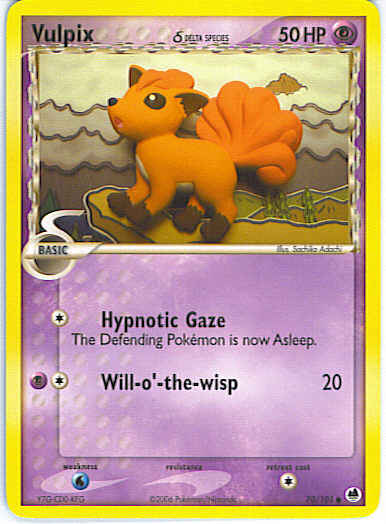 | Type | Psychic | | Pokemon serie | Dragon Frontiers | | Stadie | Basic | | HP | 50 | | Sjældenhed | Common | | Tilbagetrækning | 1 | | Svaghed | W | | Kortnummer | 70 | | Evne | [C] Hypnotic Gaze - The Defending Pokemon is now Asleep. [CP] Will-o'-the-wisp (20)