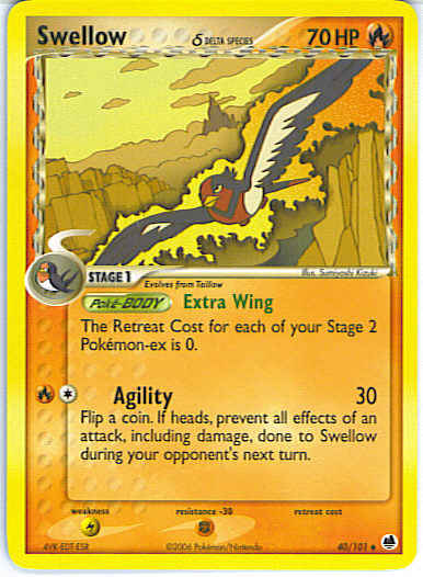 | Type | Fire | | Pokemon serie | Dragon Frontiers | | Stadie | Stage 1 | | HP | 70 | | Sjældenhed | Uncommon | | Modstand | F | | Svaghed | L | | Kortnummer | 40 | | Evne | [CR] Agility (30) Flip a coin. If heads, prevent all effects of an attack, including damage, done to Swellow during your opponent's next turn.
