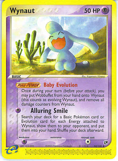 | Type | Psychic | | Pokemon serie | Sandstorm | | Stadie | Basic | | HP | 50 | | Sjældenhed | Uncommon | | Tilbagetrækning | 1 | | Svaghed | P | | Kortnummer | 54 | | Evne | [P] Alluring Smile - Search your deck for a Basic Pokemon card or Evolution card for each Energy attached to Wynaut, show them to your opponent, and put them in to your hand. Shuffle your deck afterward.